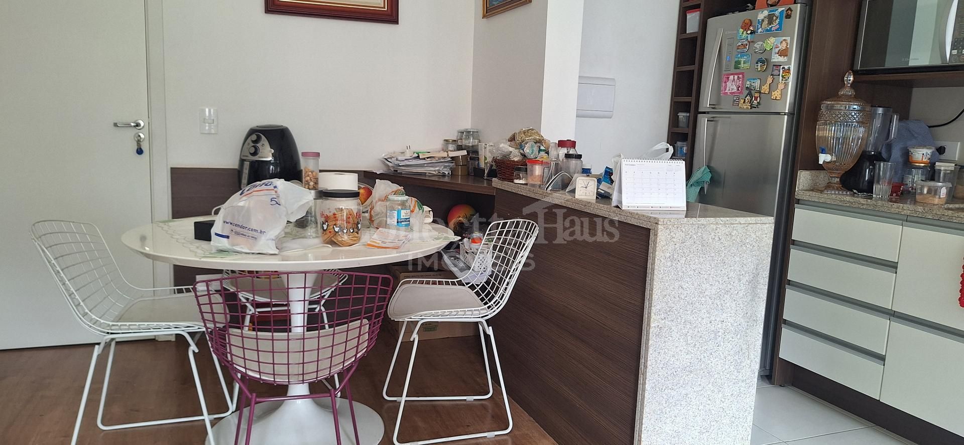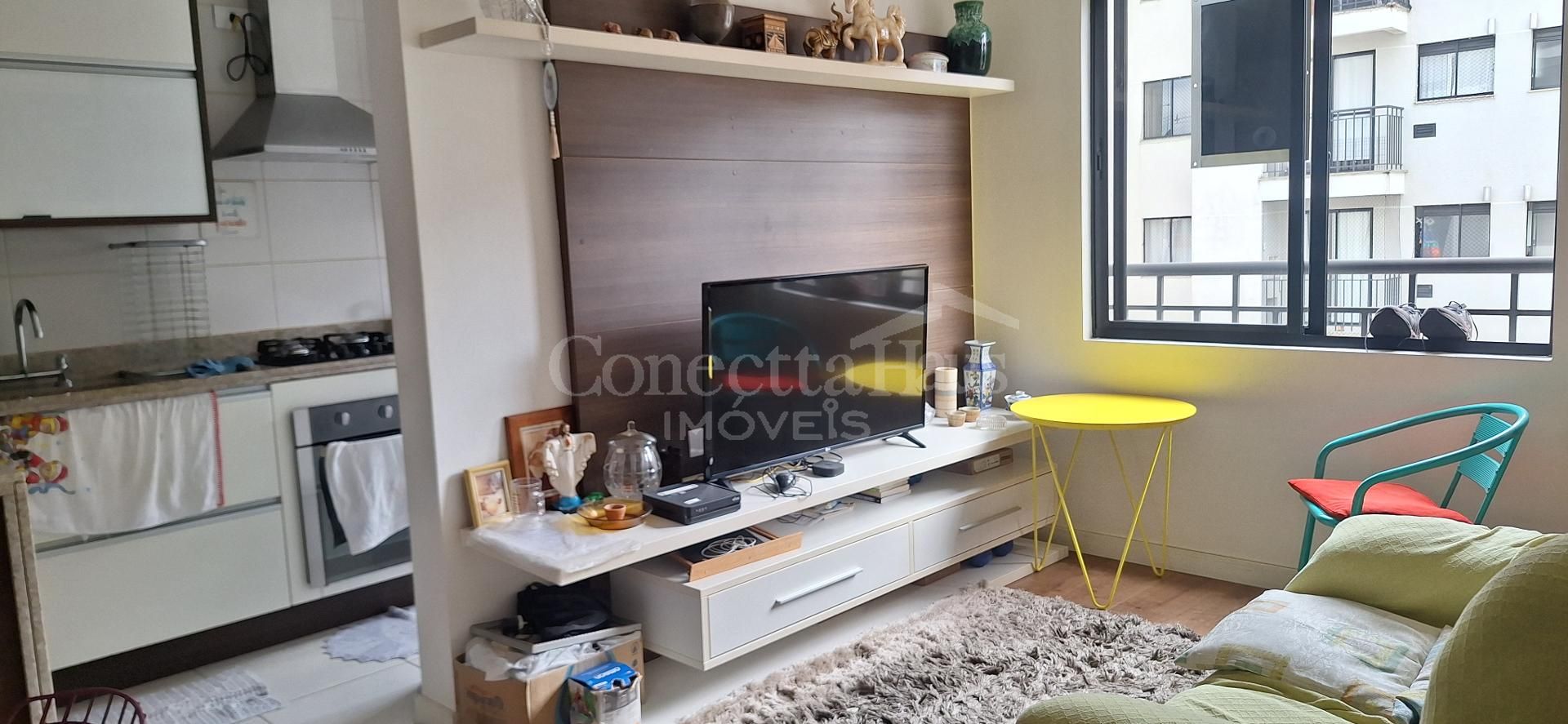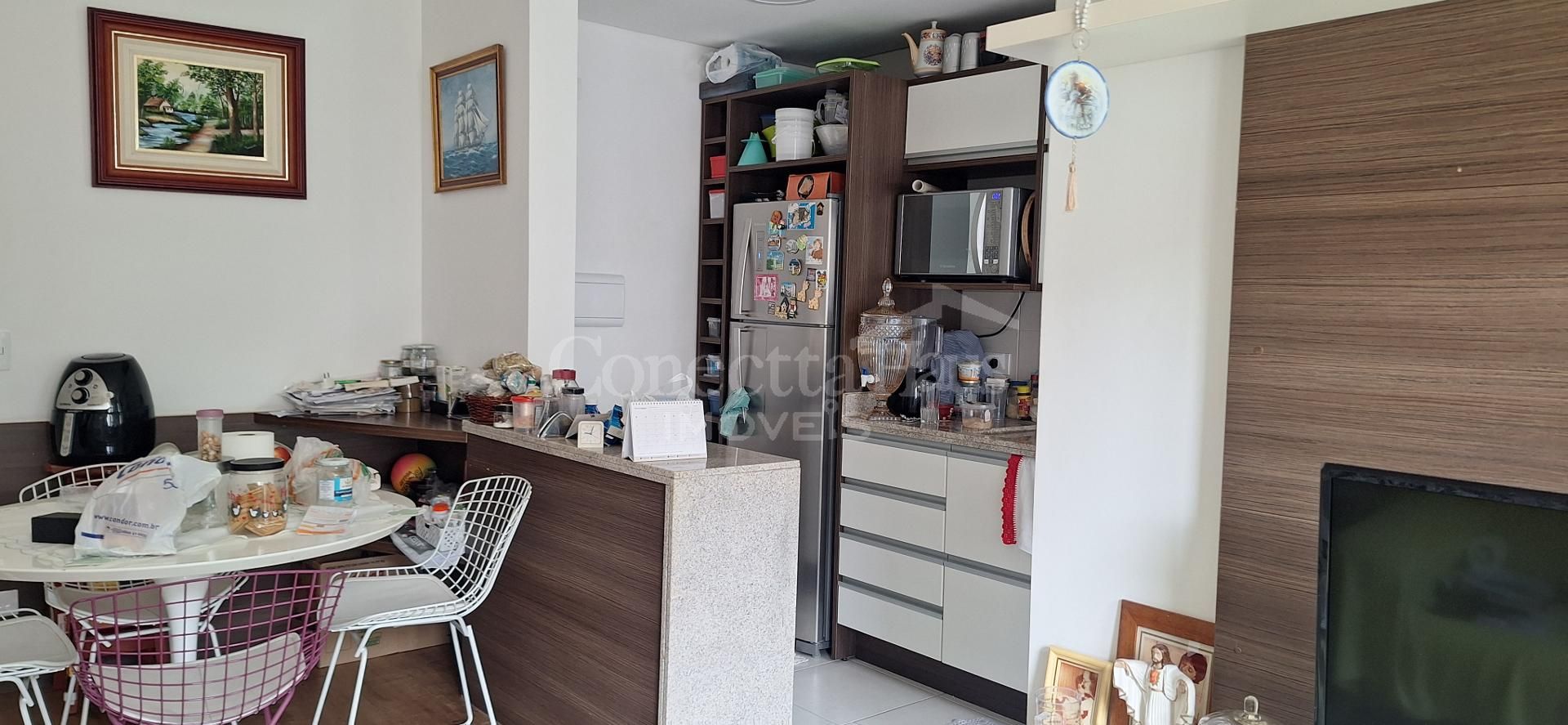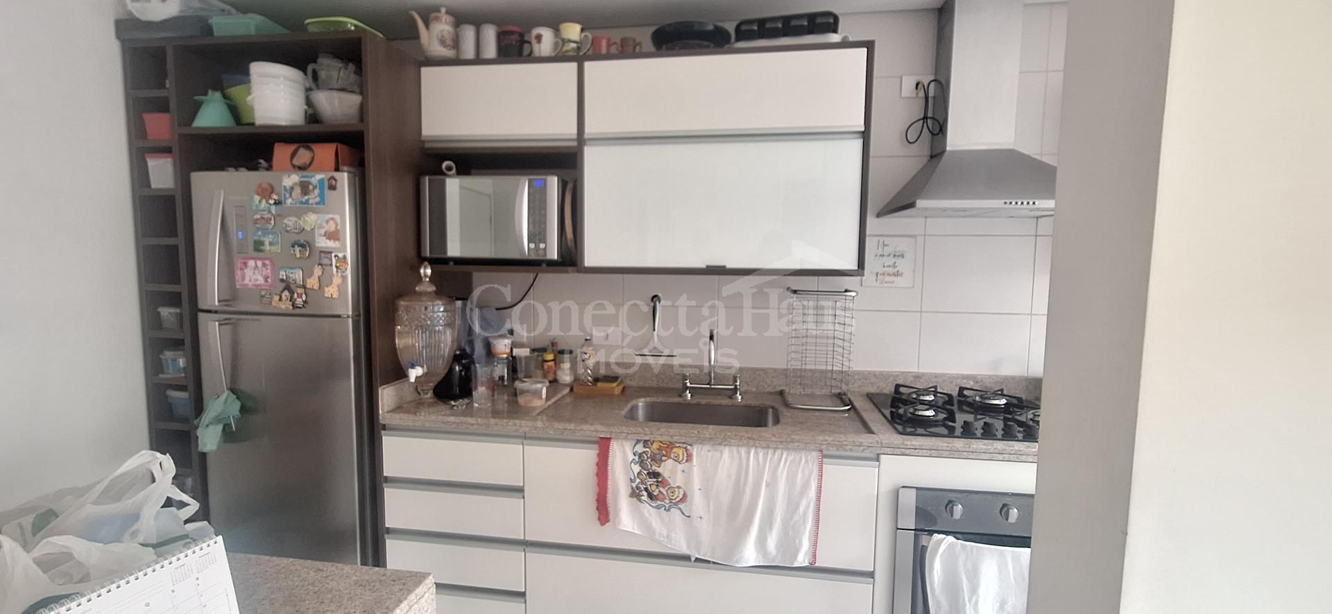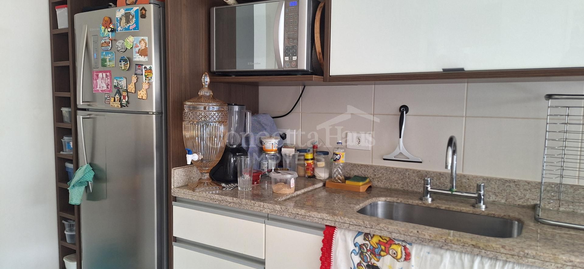 A cozinha e a sala possuem móveis sob medida, oferecendo um ambiente funcional e bem aproveitado.