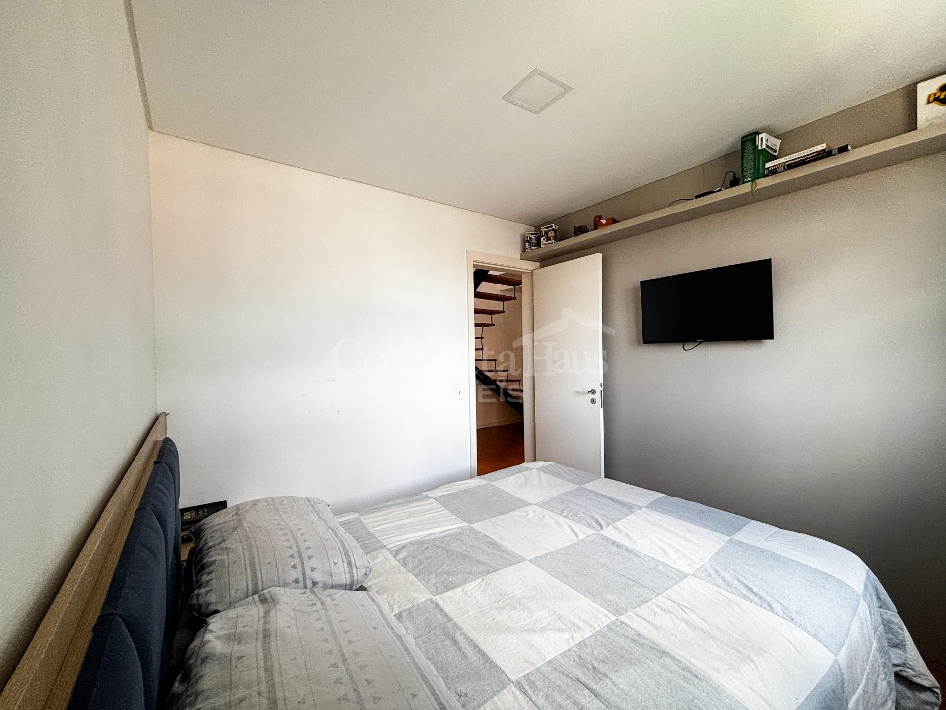Quarto Principal com cabeceira planejada para cama e painel para televisão.