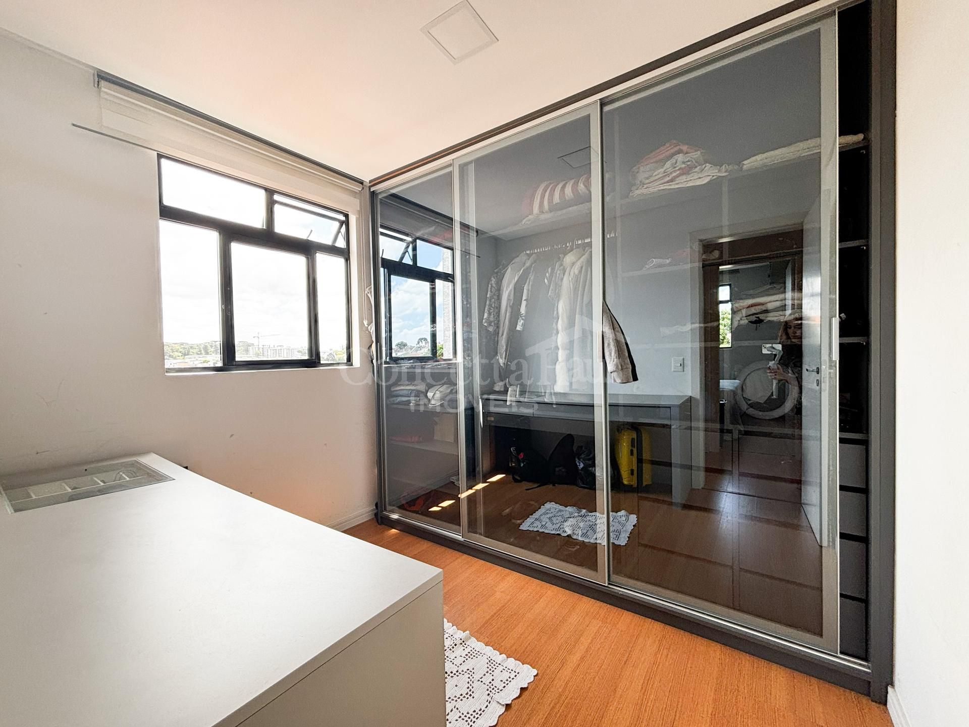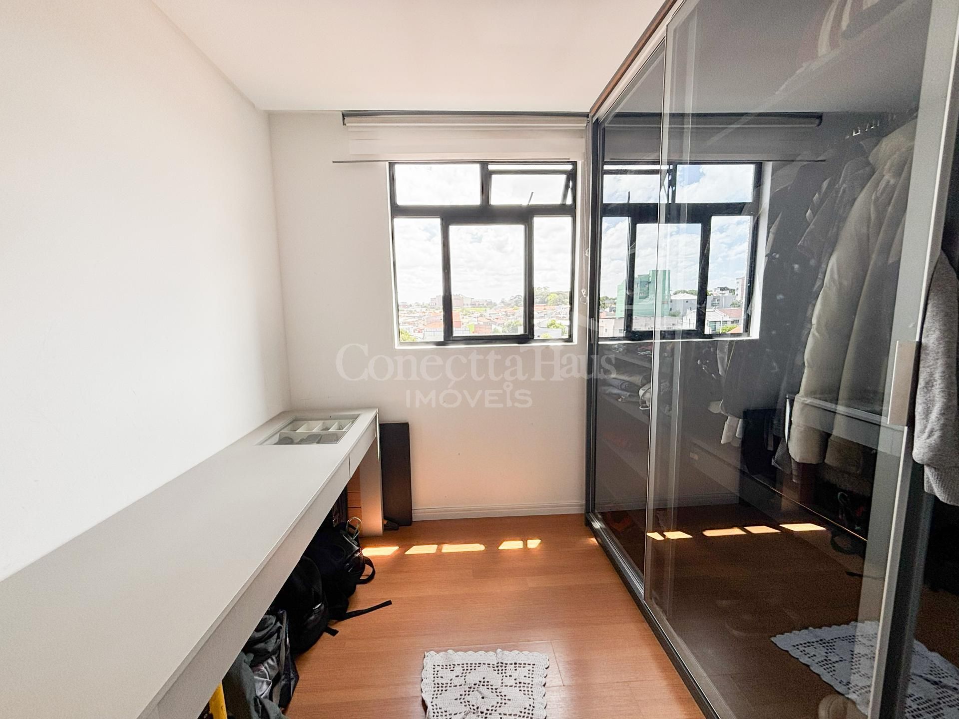 Quarto com closet planejado e escrivaninha integrada, ideal para home office ou penteadeira.