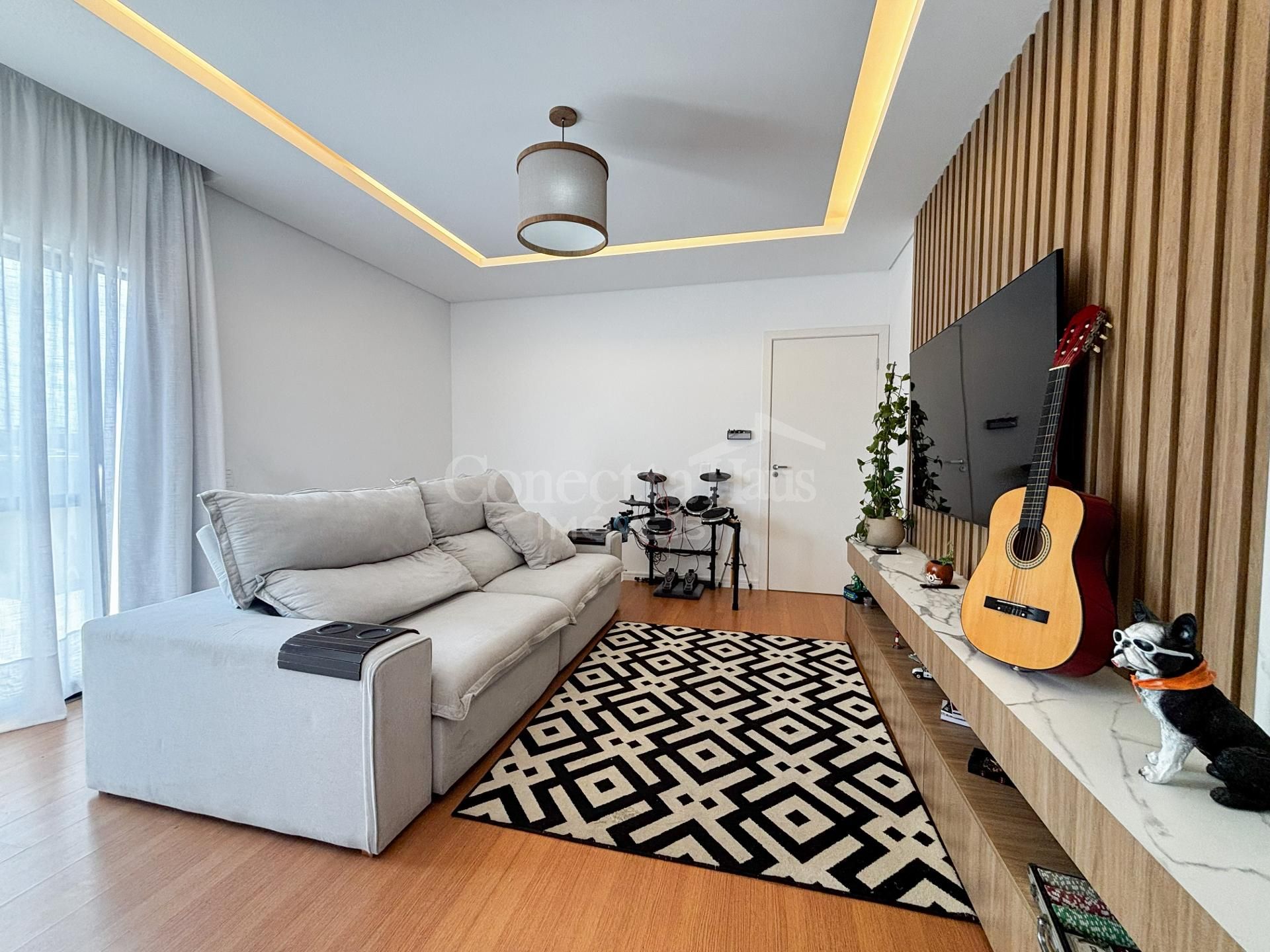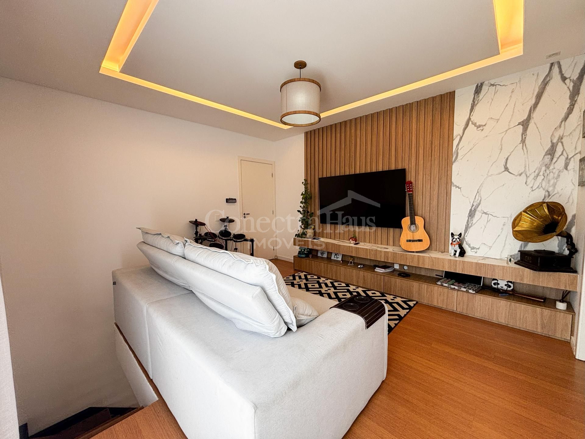 Sala de Estar Ambiente aconchegante com painel de televisão montado e papel de parede com efeito porcelanato.