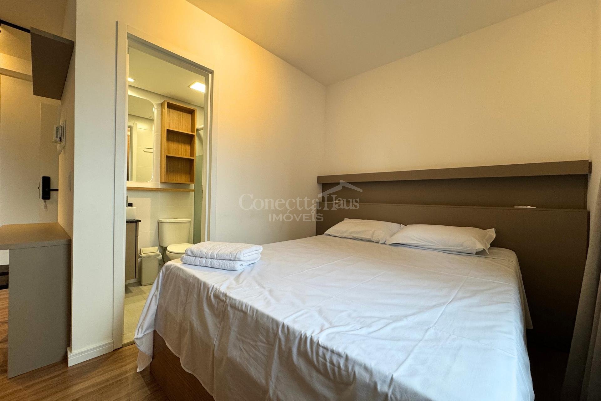 - Cozinha equipada, cama, armário, bancada de trabalho e ar-condicionado