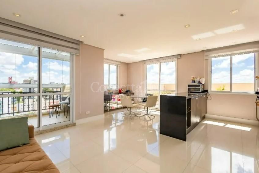 Sala de estar ampla, integrada à sala de jantar e à sacada, proporcionando iluminação natural e vista panorâmica