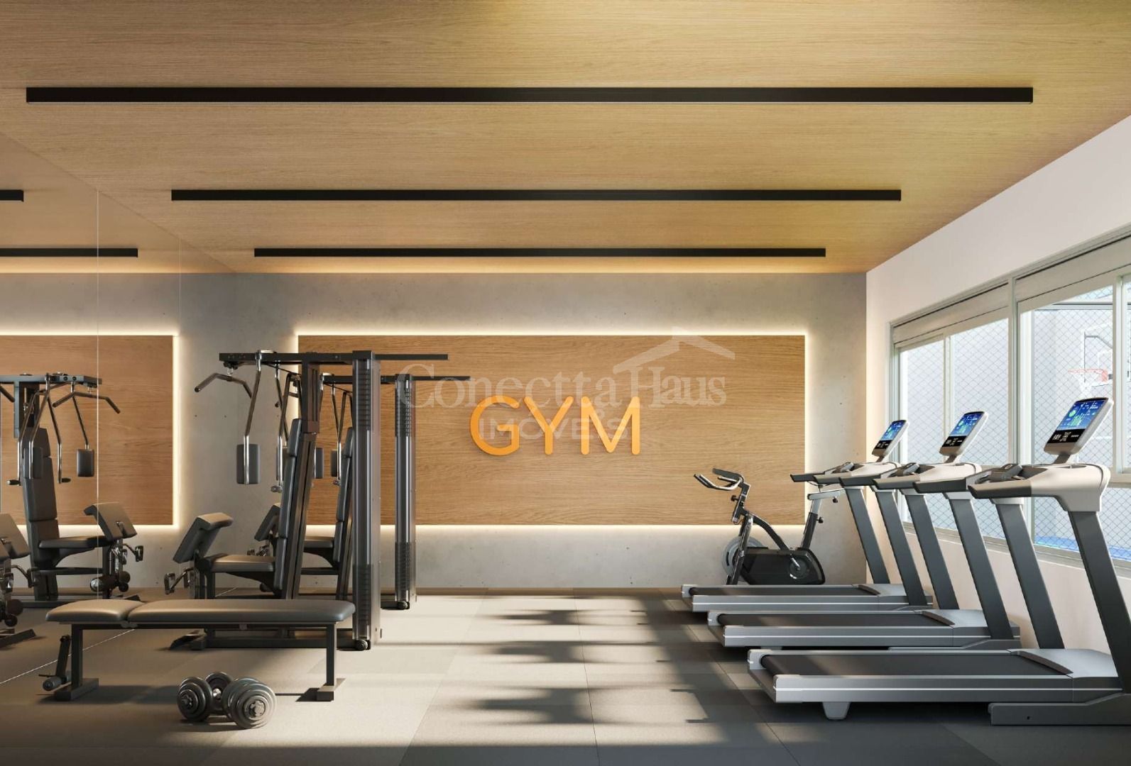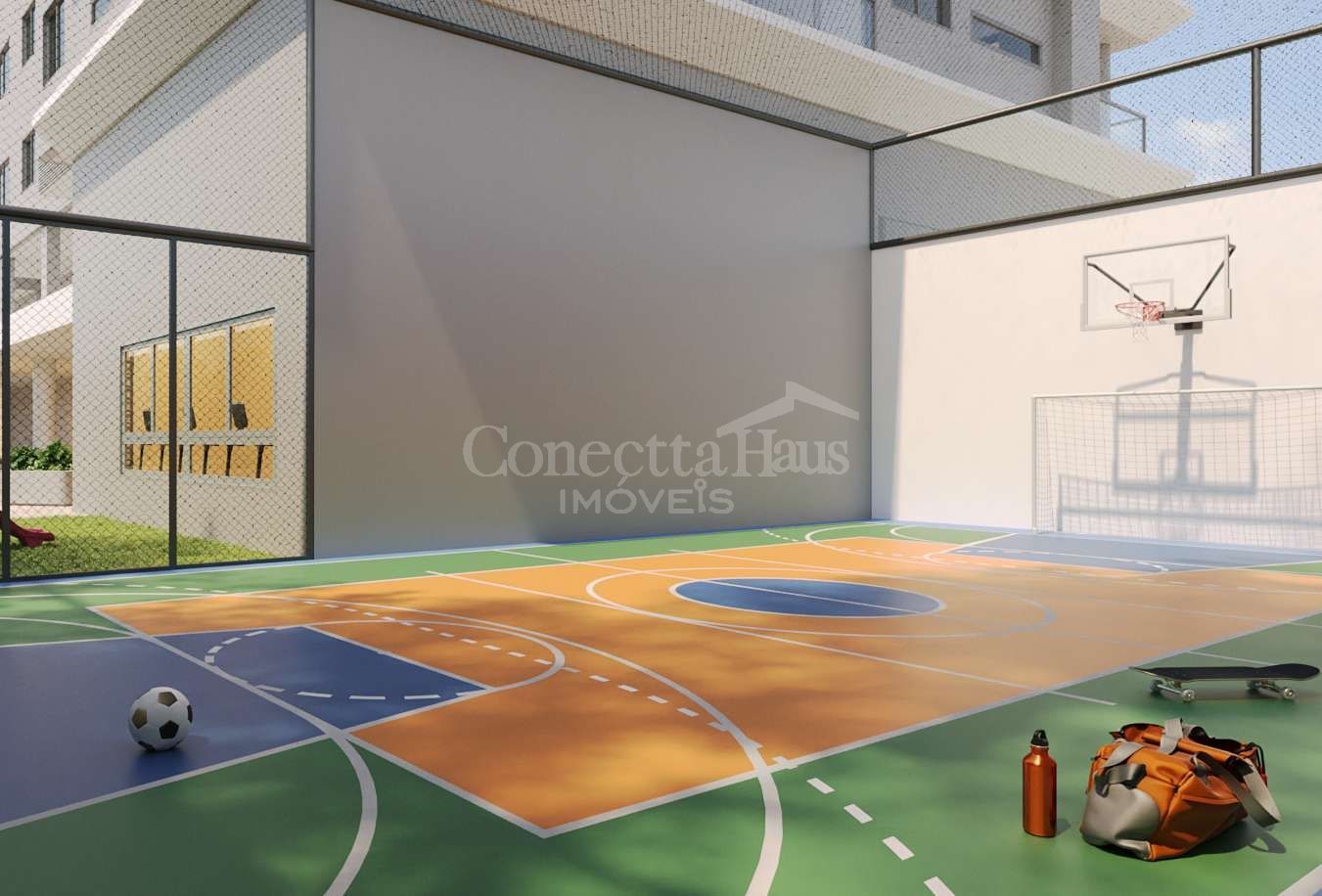 Academia equipada, quadra poliesportiva e playground para lazer e saúde.