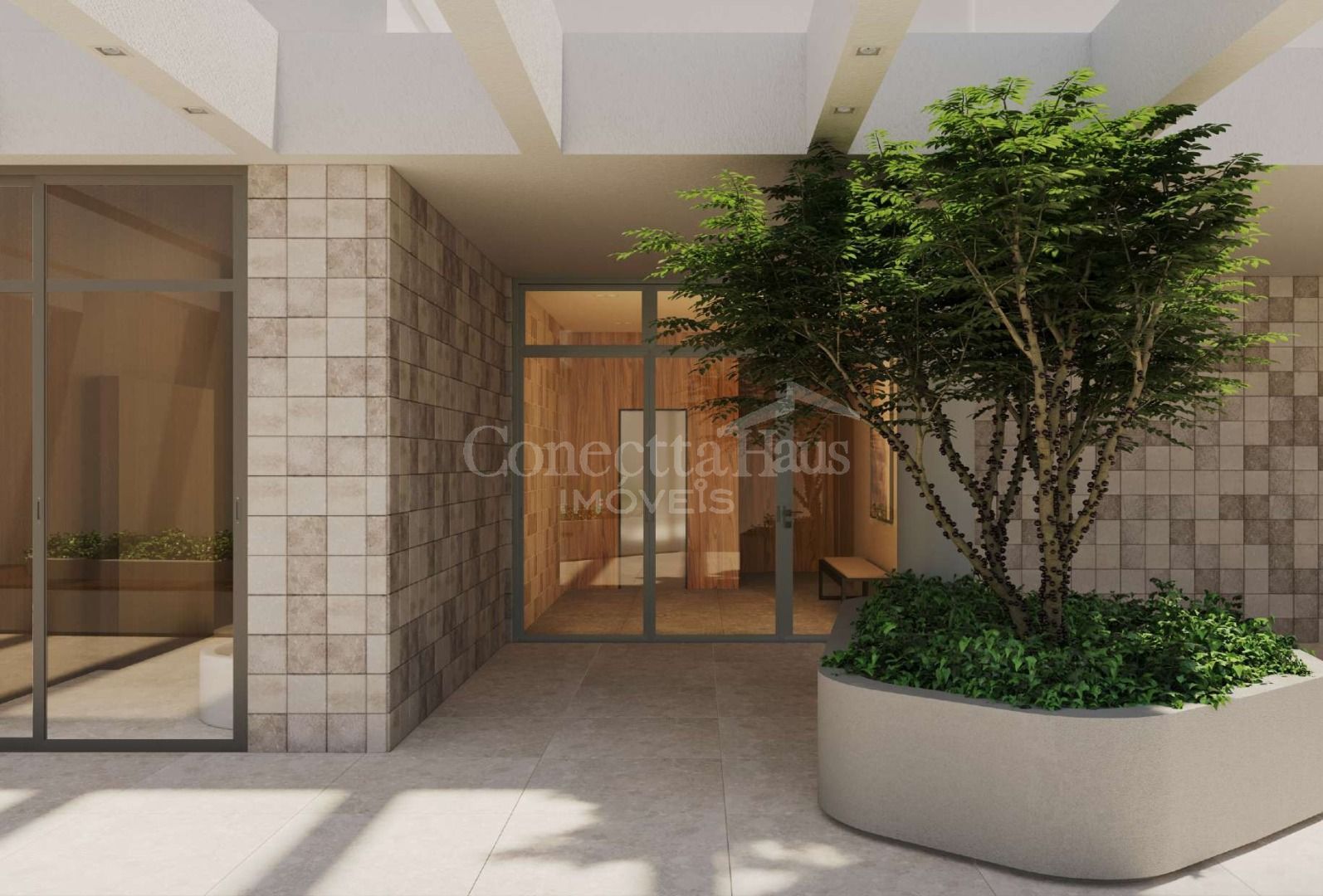 Hall de entrada imponente, elevadores modernos e elegante boulevard interno.