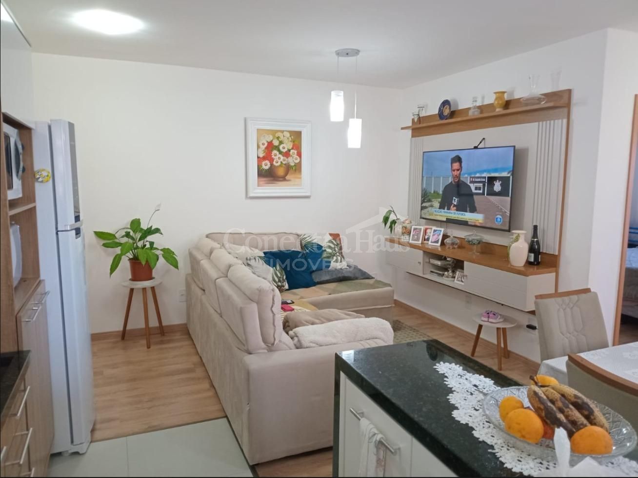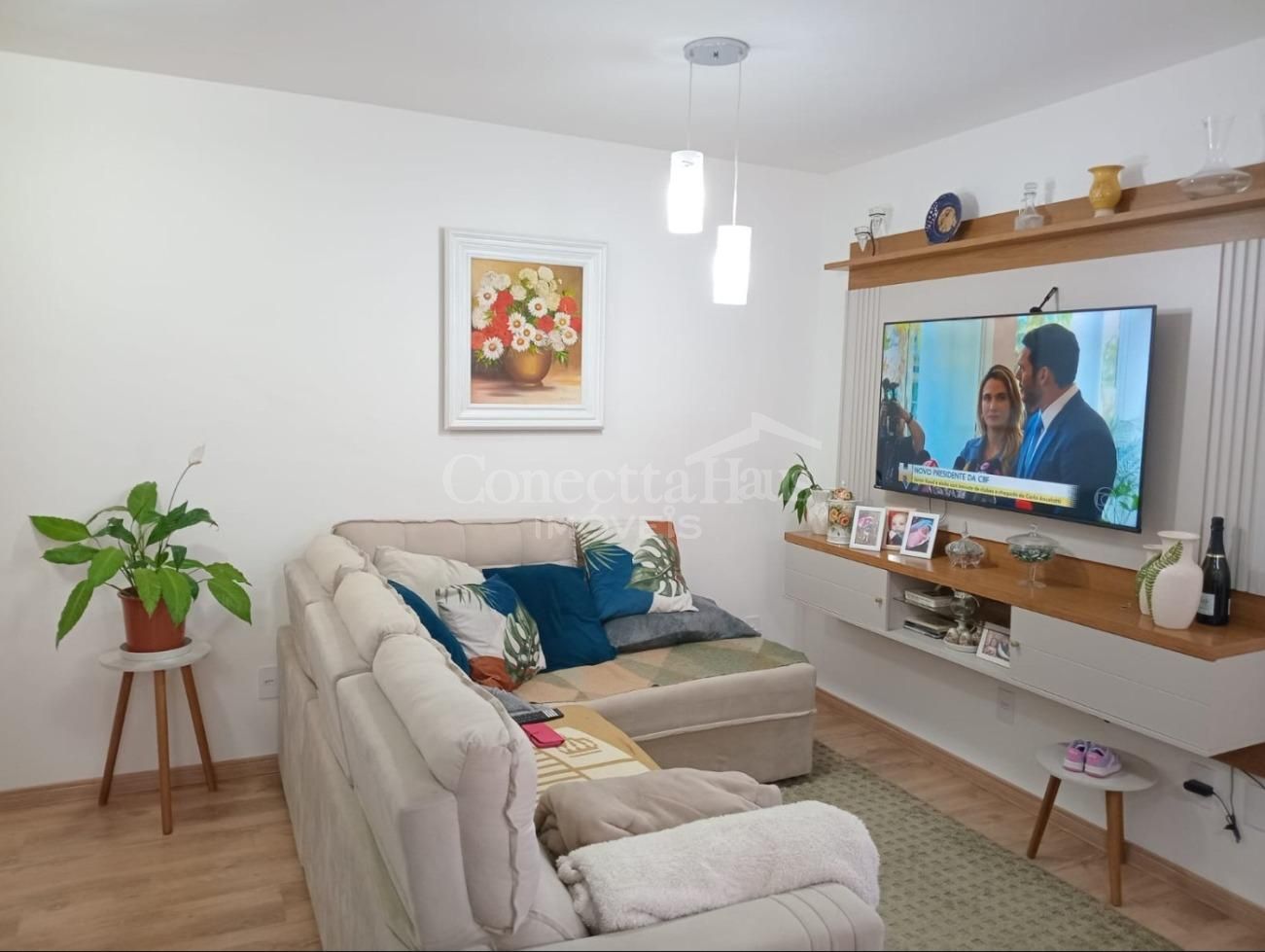 Sala de estar e sala de jantar aconchegantes, ambas com piso laminado