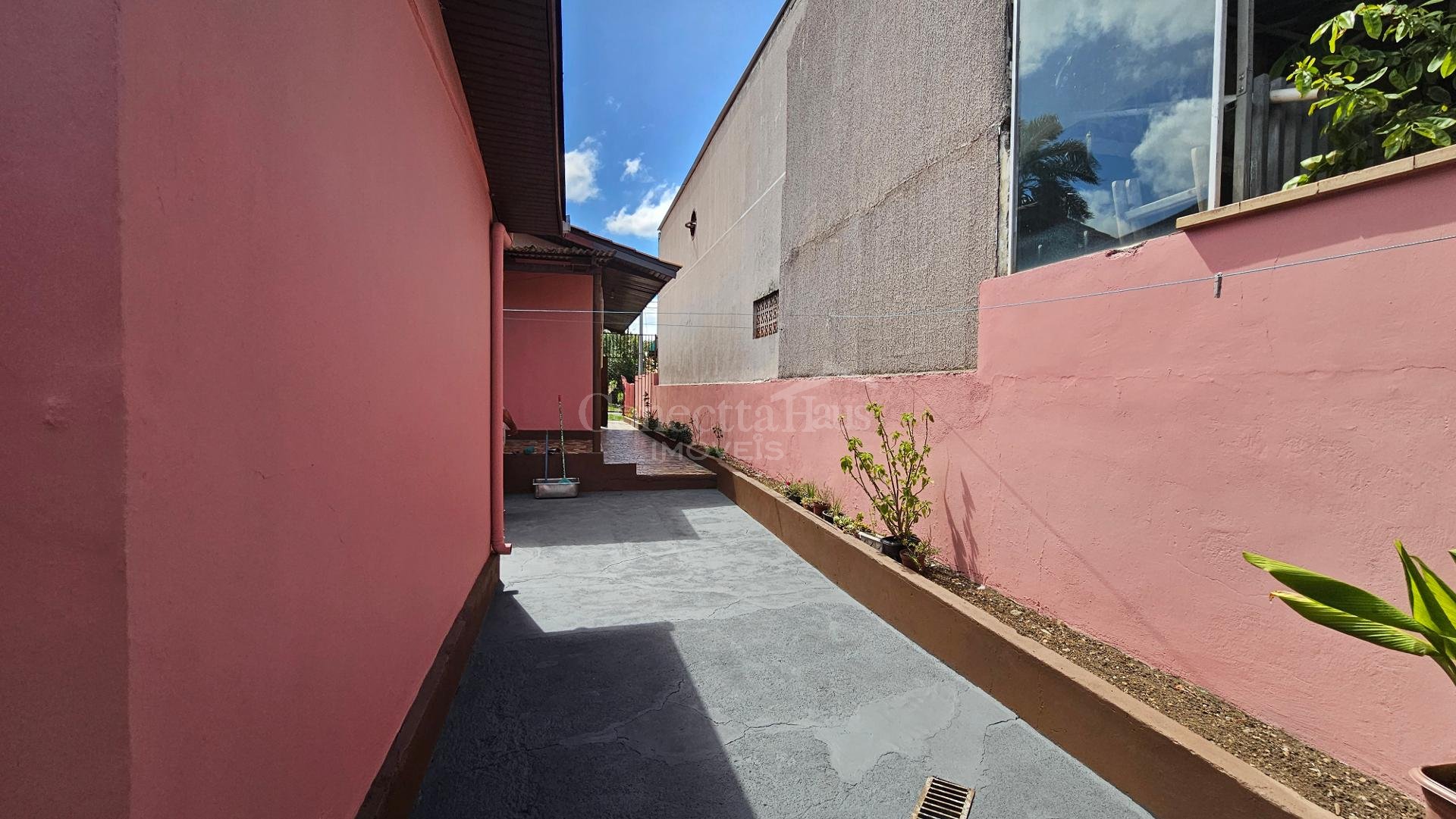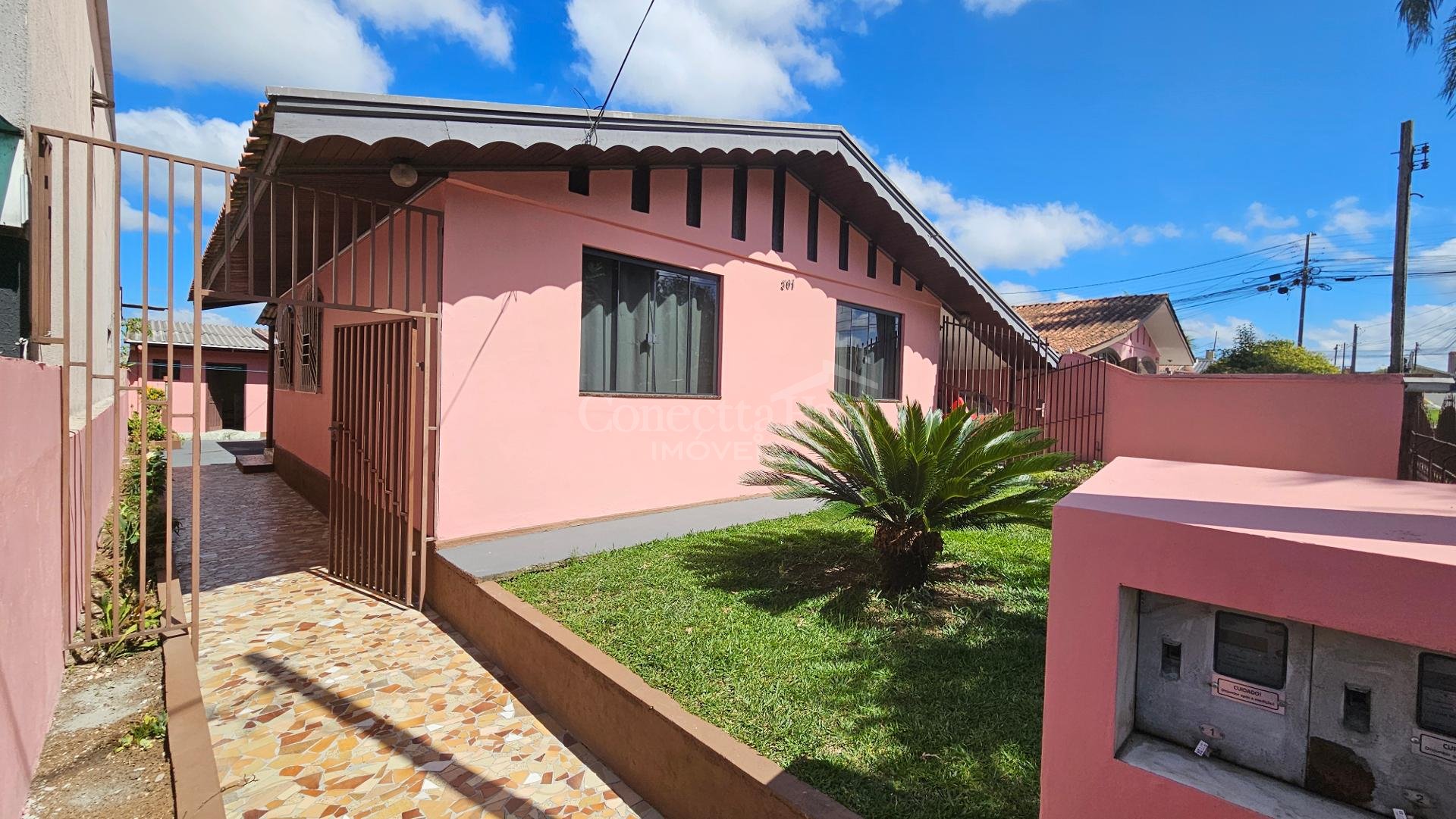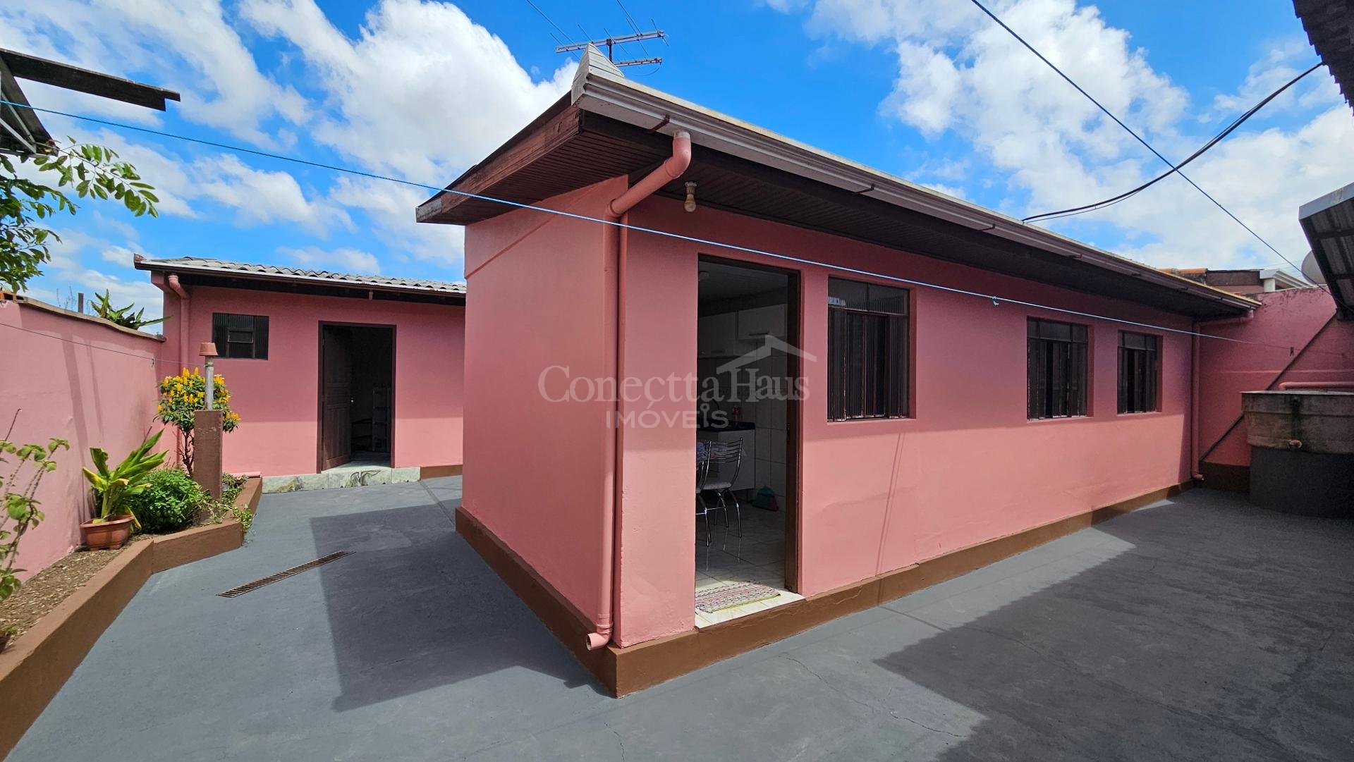Casa principal: cerca de 106m² com 3 quartos, sala, cozinha, banheiro, despensa e garagem.