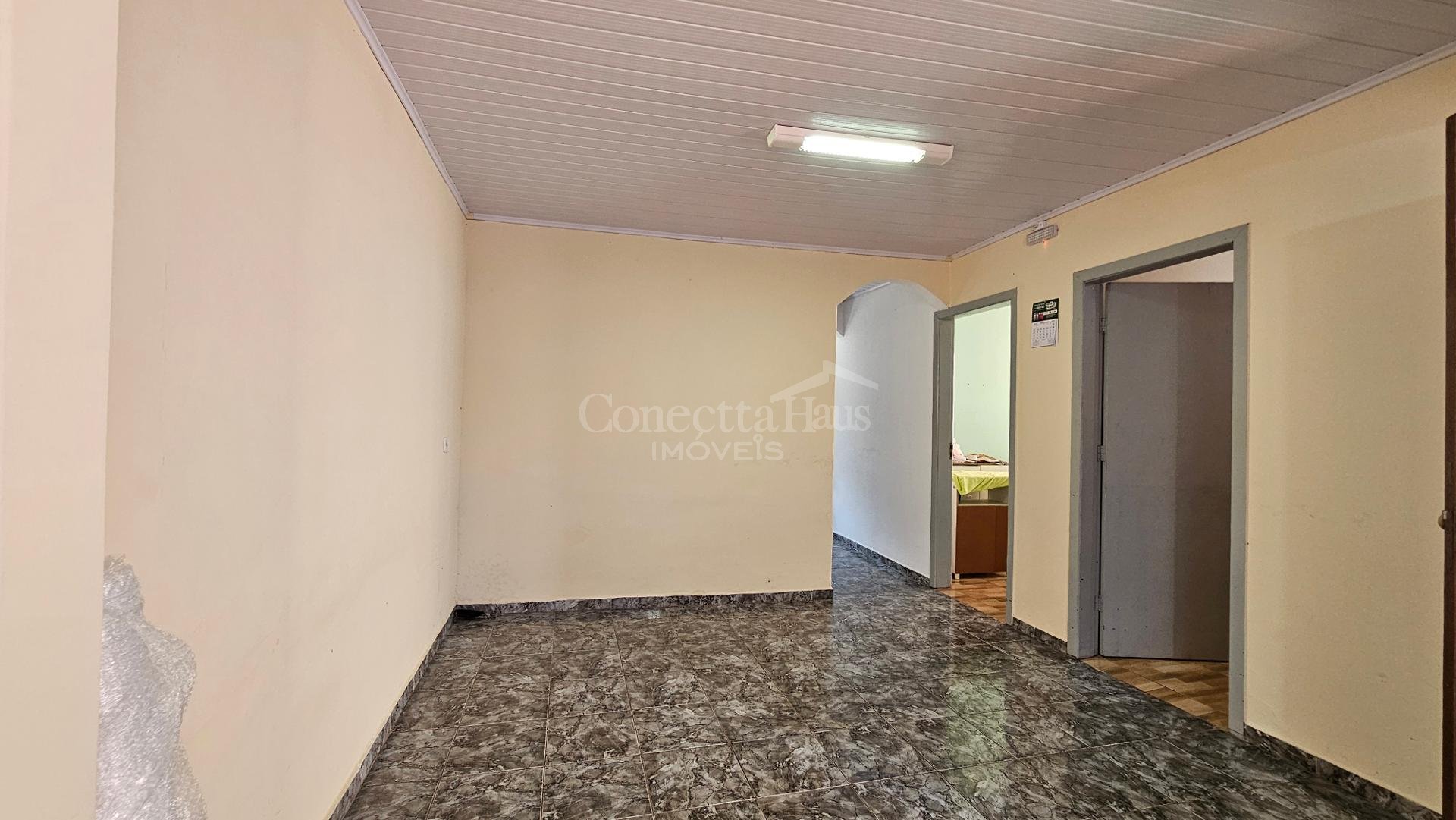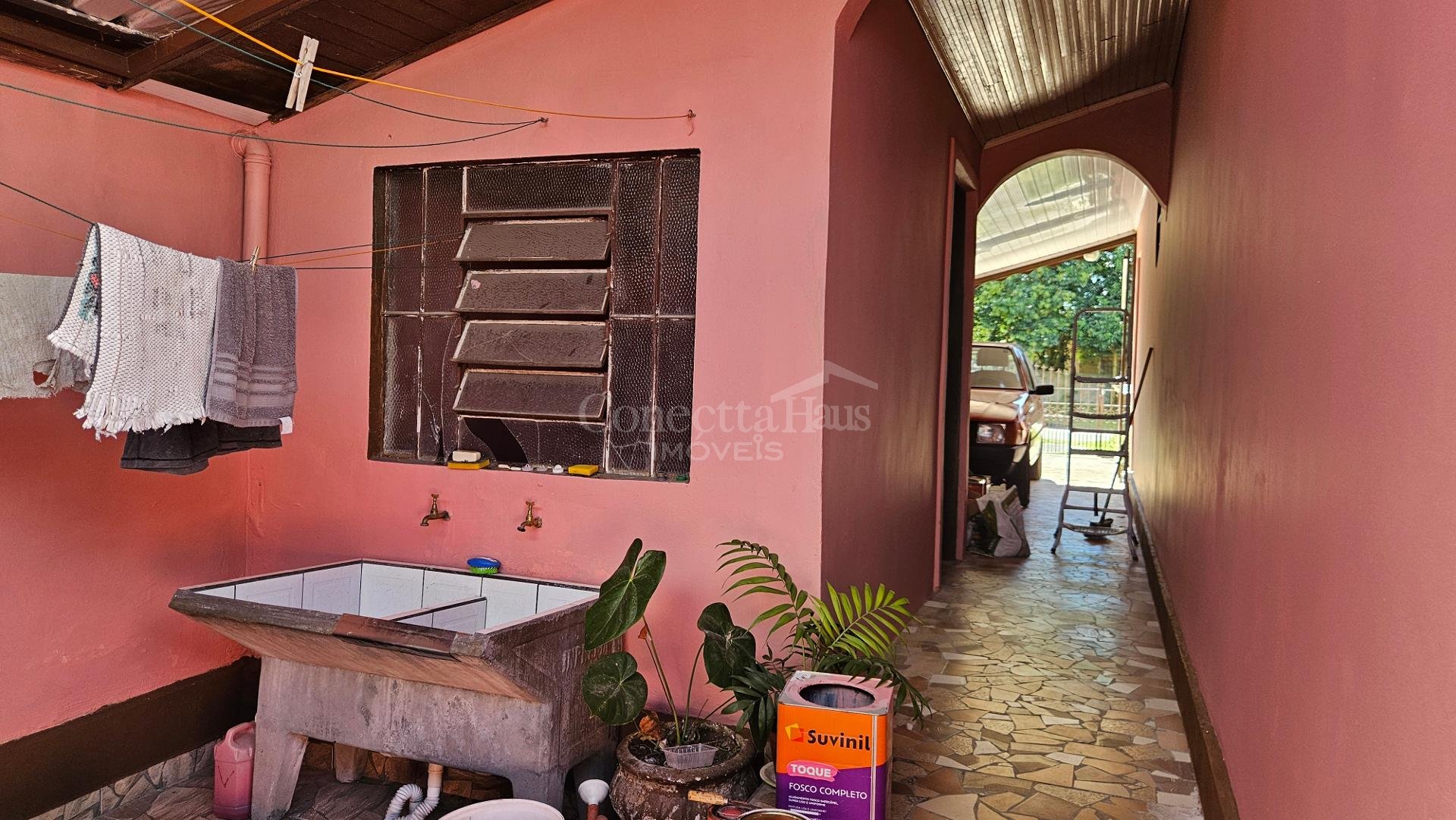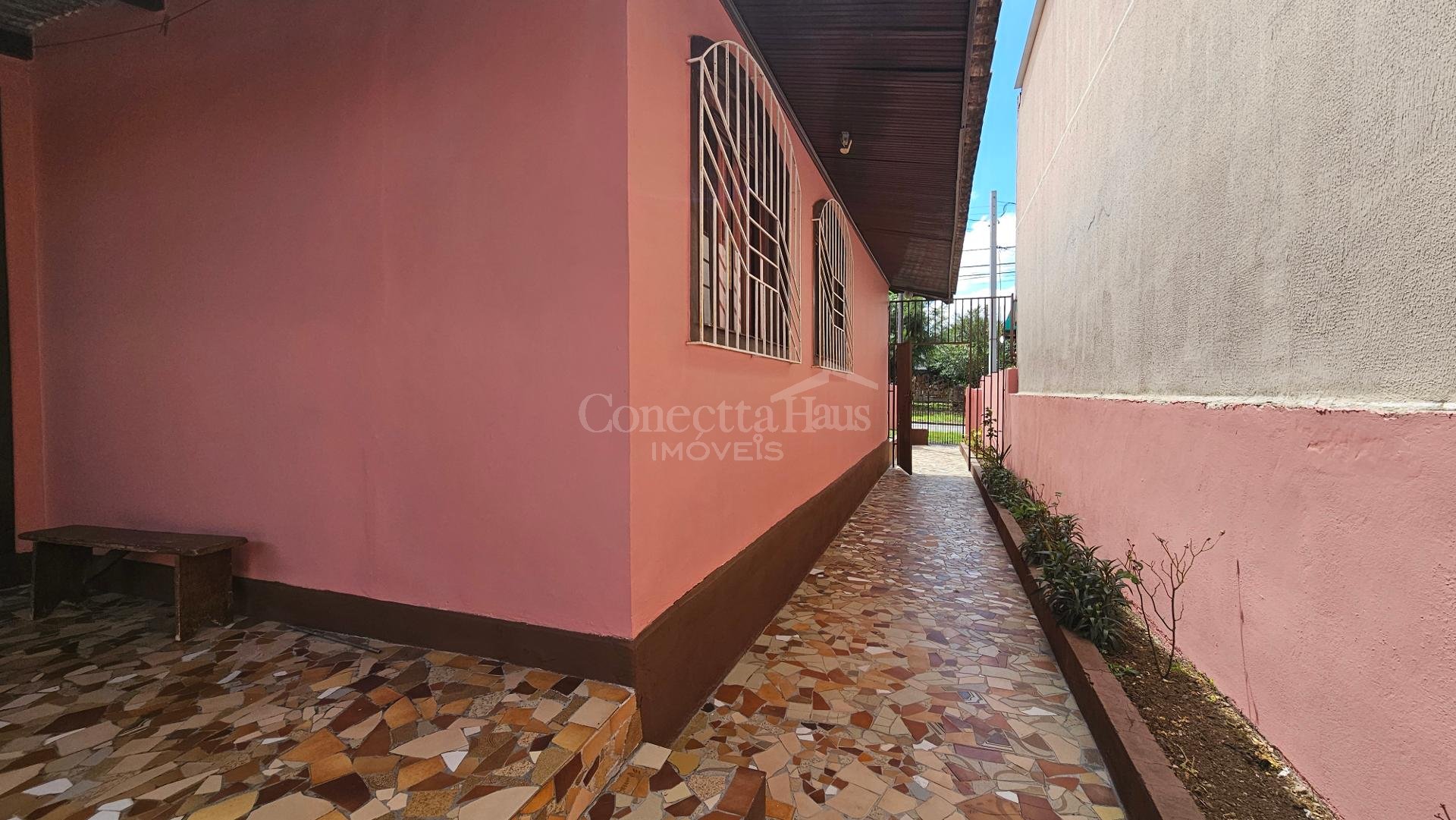 Casa principal: cerca de 106m² com 3 quartos, sala, cozinha, banheiro, despensa e garagem.